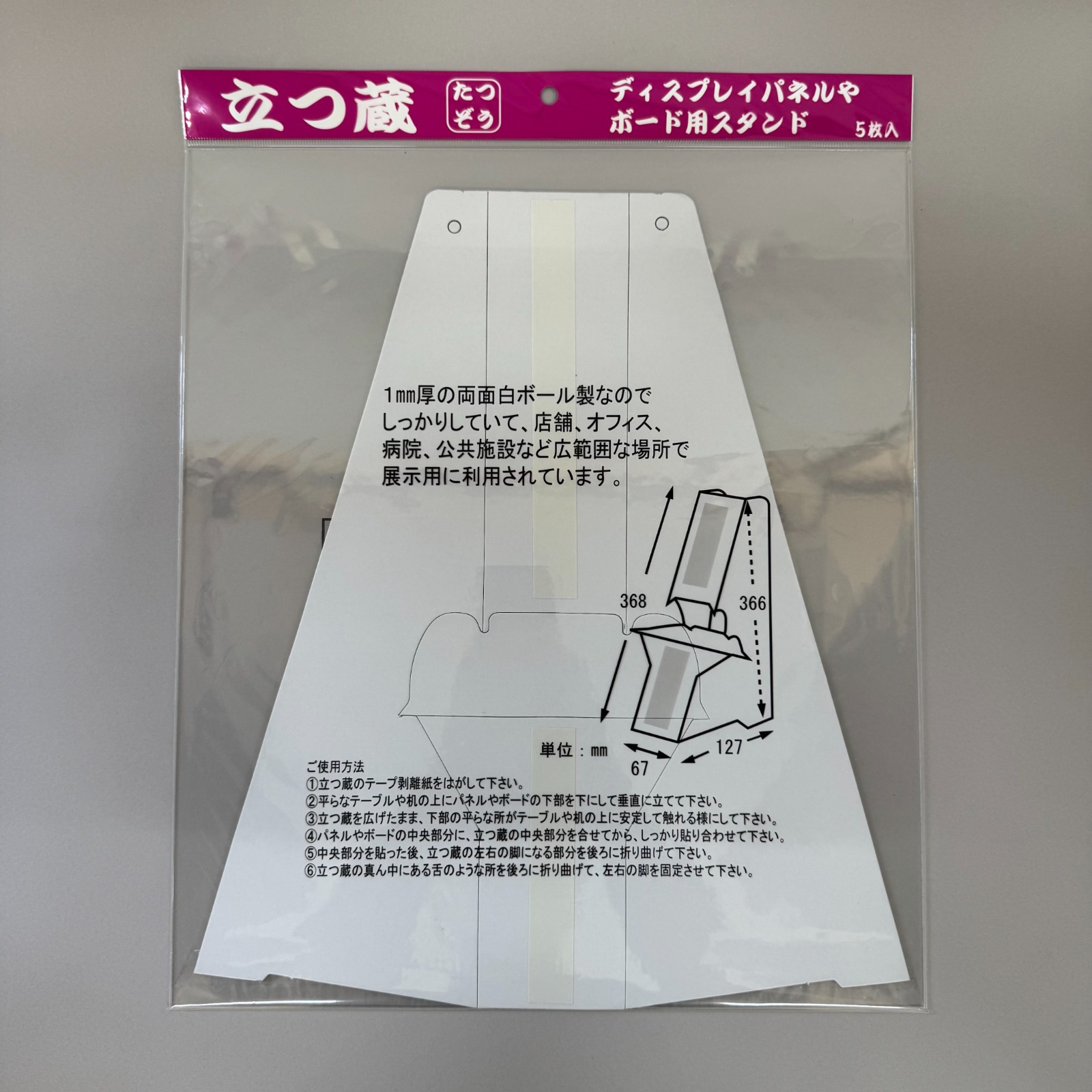 表面に強力両面テープが付いているので立てたいものに直接貼って使います。